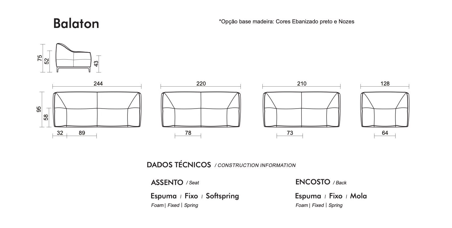 Caixa do assento: Em madeira de reflorestamento Eucalipto, chapa de MDP de 15mm e molas;